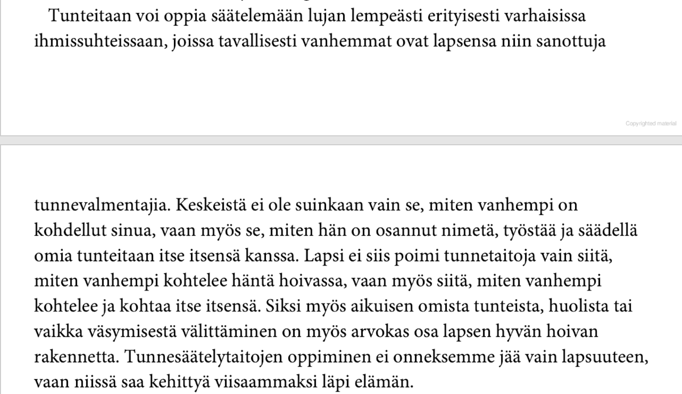 Ohjeita, neuvoja ja sääntöjä tuntuu olevan joka suuntaan. Helpommastakin menee pää sekaisin. Lähes päivittäin tekisi mieleni hihkua Ykköselle ”oletpa kaunis” ja Kakkoselle ”oletpa hauska”. Ja sata muutakin juttua. Melkein jokaisen mielessäni kuplivan kehun kohdalla mietin: luonko nyt jotain paineita, ennakko-oletuksia, vääristynyttä minäkuvaa, pakonomaista täydellisyyden tavoittelua? Vai vahvistanko vain itsetuntoa, ihan niin kuin pitää?