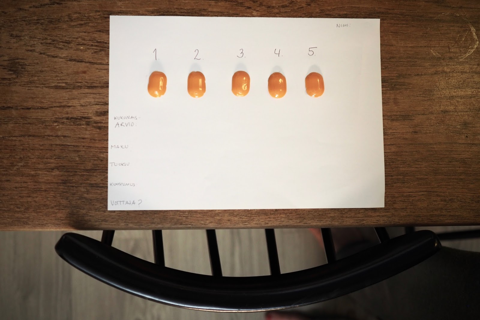 Testitilanne oli todella jännittävä. Osallistujat saivat arvioida jokaista viittä palaa maun, tuoksun, koostumuksen ja yleisen arvion mukaan. Jokaisen oli myös nimettävä omia makunystyröitä eniten hivellyt pieni auringonpalanen. Tiukan kisan jälkeen testipaikka nro 3 nousi voittajaksi. Ihan sama sinänsä, kun samojahan ne kaikki oli.