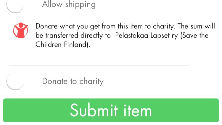Jos ostaminen oli helppoa, oli myyminen vielä isompi iloinen yllätys. Vaikka keväisessä iltavalossa yhdellä kädellä ja viisivuotiaan nakupellen avustamana otetut kuvat eivät ehkä ole ihan parasta Zadaa-luokkaa (ja tekstit saattoi lähteä vähän lapasesta iltaväsymyksen pyörteissä), sovellus ohjeisti erittäin tehokkaasti kokemattomampaakin myyjää ottamaan oikeista kohdista kuvat ja kertomaan vaatteesta mm. istuvuuden ja materiaalin osalta. Tämän kaiken oikeastaan jo tiesinkin ja nyökkäilin lähinnä tyytyväisenä kun myyntikokemus oli juuri niin helppo kuin toivoinkin. Mutta sitten, se paras yllätys: Vaatteen hinnan voi myös laittaa menemään suoraan hyväntekeväisyyteen. Nyt on kova. Minulle vaatteiden jälleenmyynti on ihan liian usein suoraan Fidalle viemistä joka tapauksessa. Sinne vain ei tunnu kovin järkevältä viedä bilemekkoja. Facebookissa tai kaverilta en toisaalta ehkä kehtaa pyytää rahaa omista kamoistani, vaikka ne ovatkin hyvässä kunnossa. Mutta jos rahat voi laittaa suoraan Pelastakaa Lapset ry:lle, homma alkaa kiinnostaa.